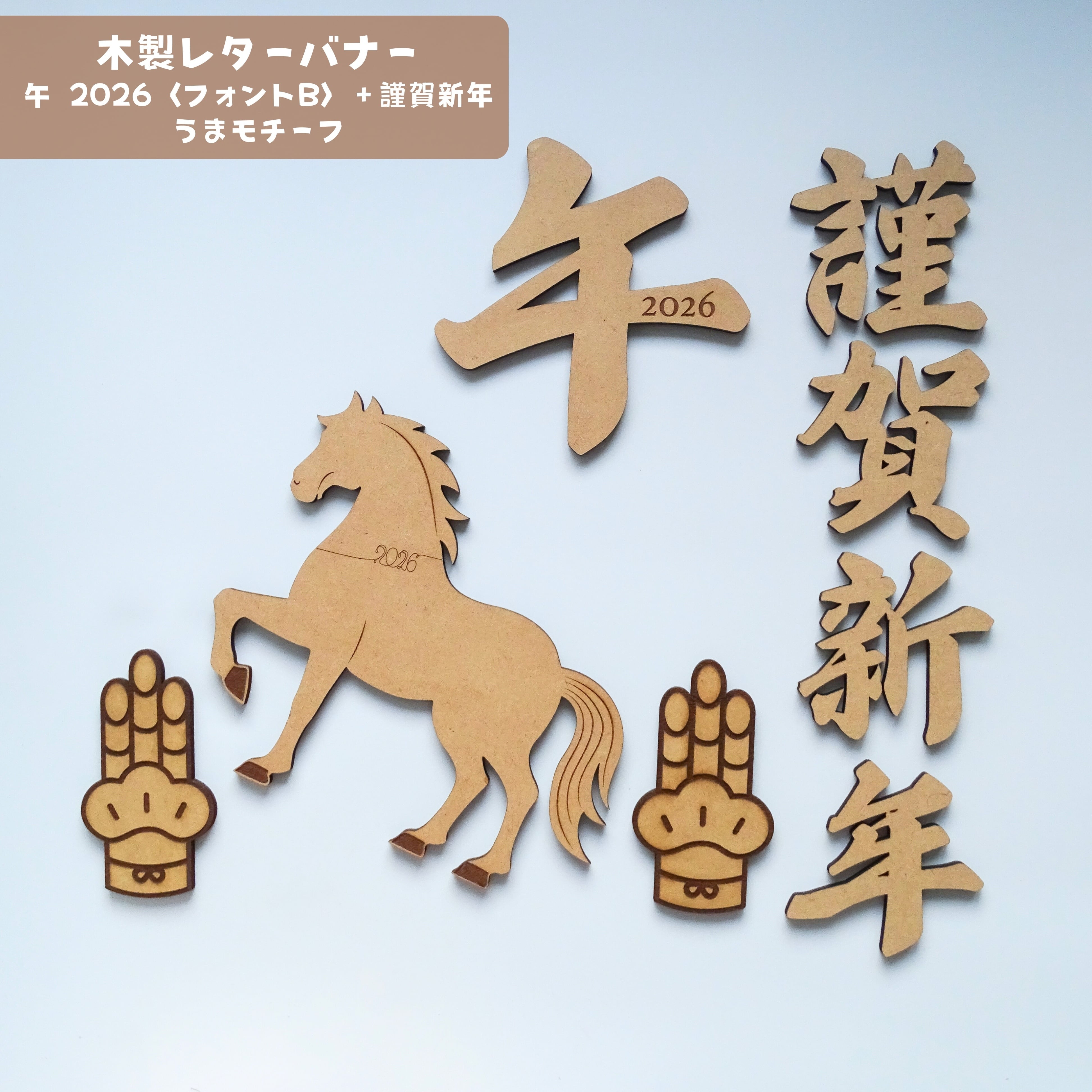 2026【 謹賀新年+午B+午モチーフセット 】木製レターバナー お正月 元旦 ガーランド 飾り おしゃれ 装飾