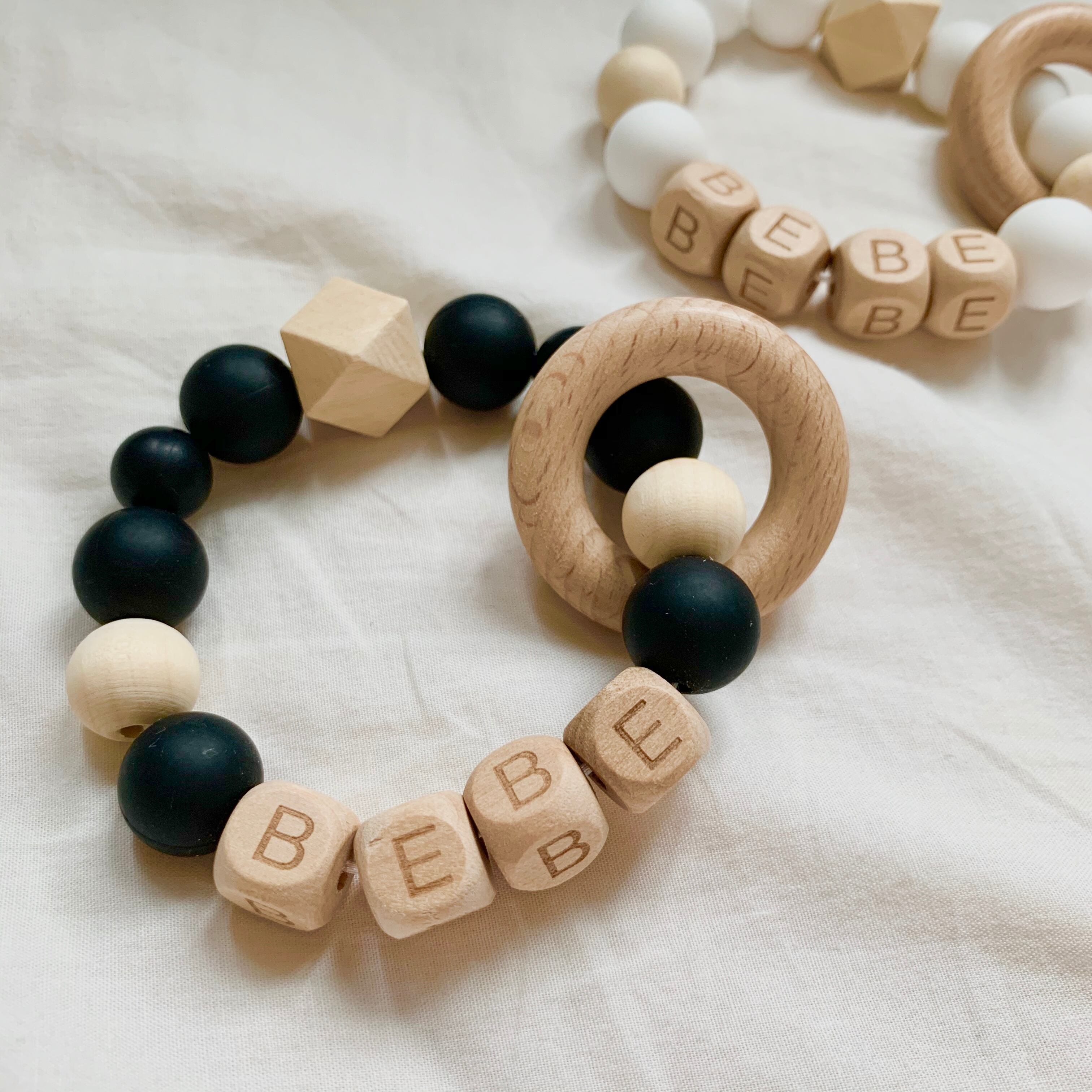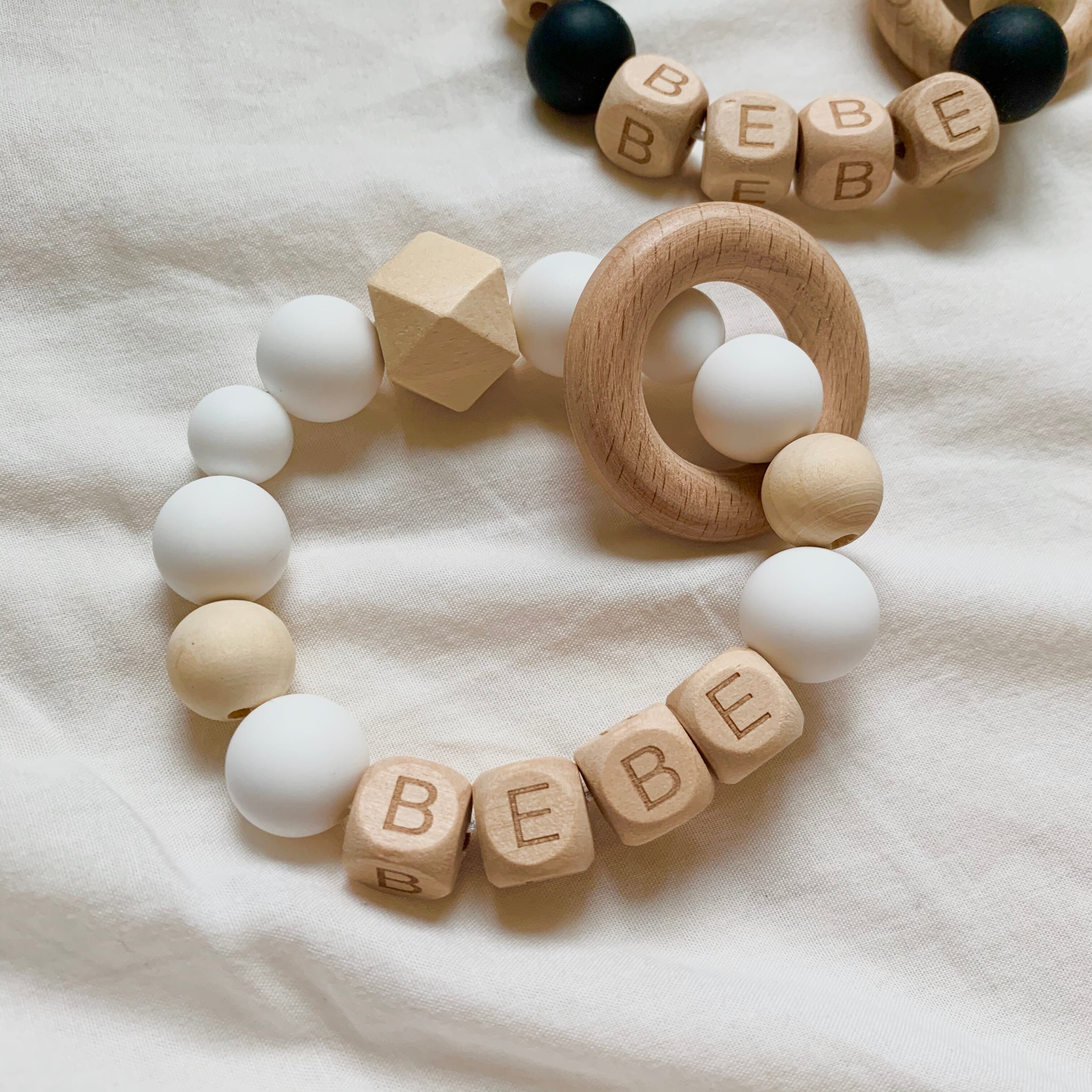 シリコンビーズやウッドパーツを用いて赤ちゃんのための可愛い歯がためやおもちゃホルダーを