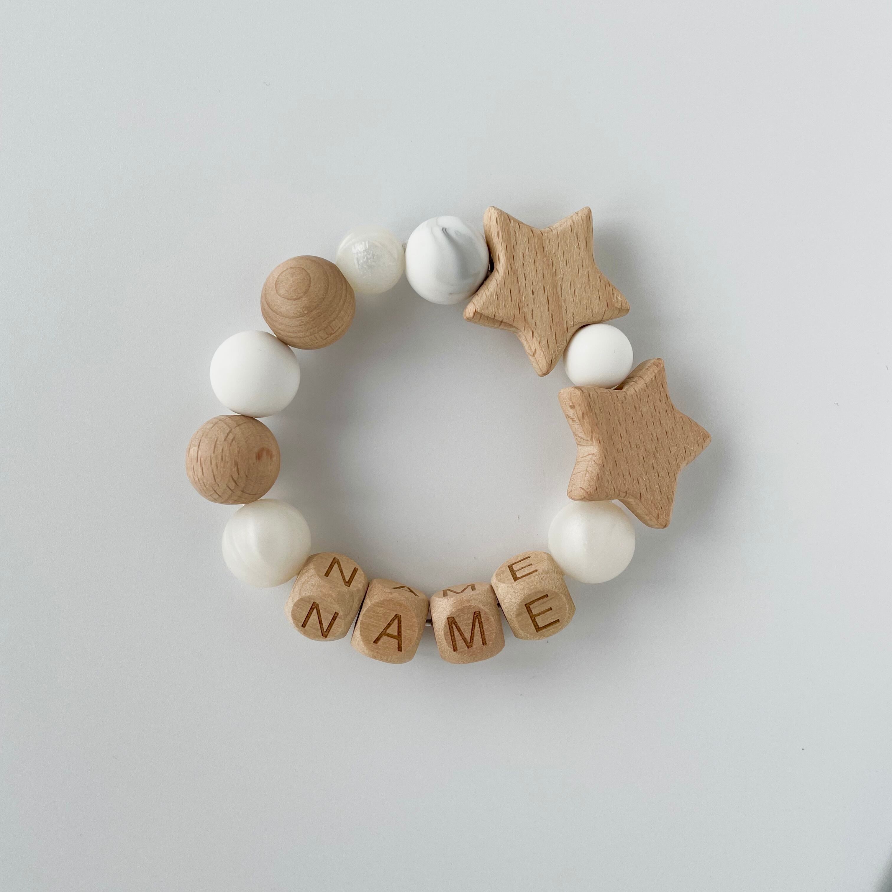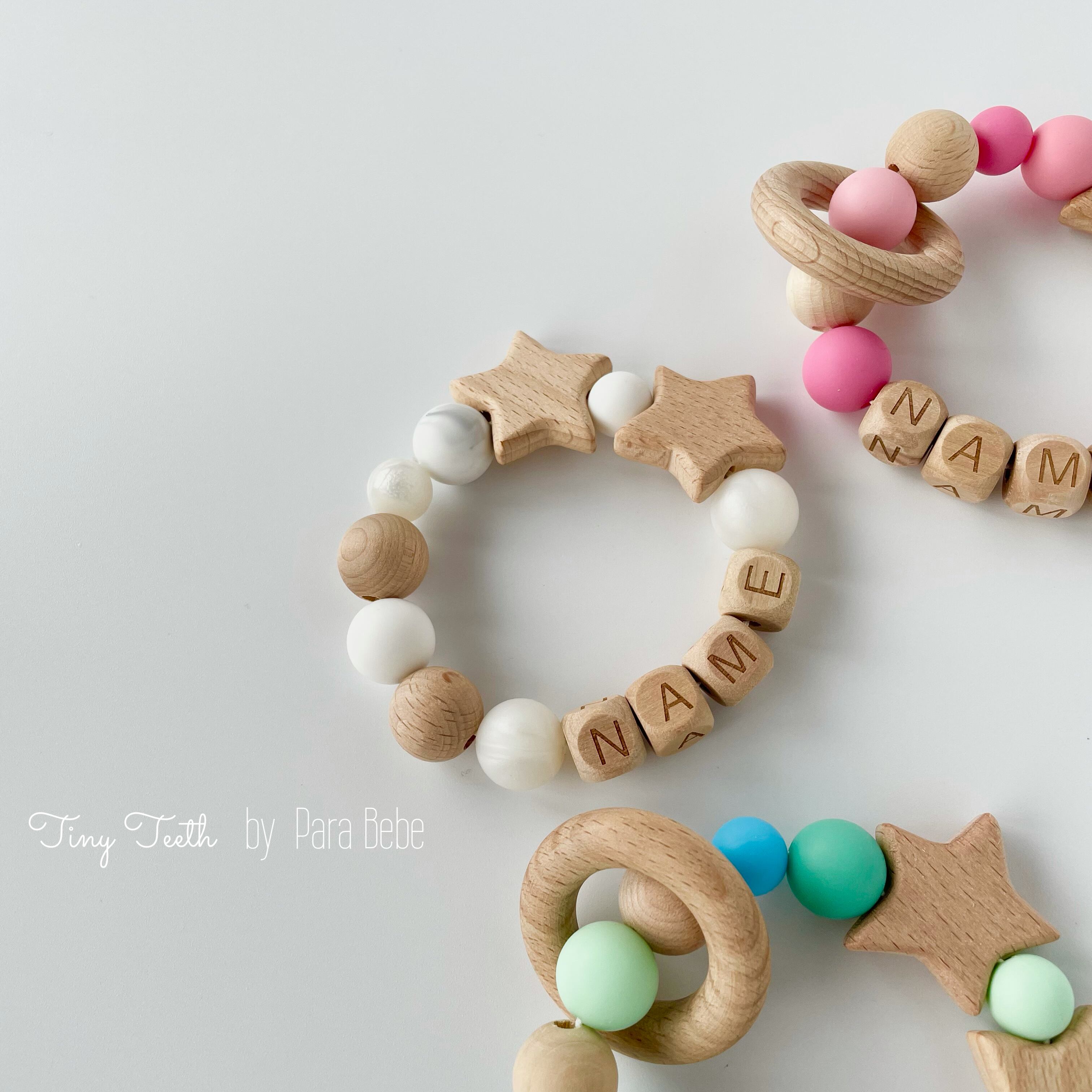 シリコンビーズやウッドパーツを用いて赤ちゃんのための可愛い歯がためやおもちゃホルダーを